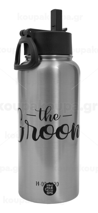 Groom & Bride (Groom), Μεταλλικό παγούρι θερμός Silver με καλαμάκι και χερούλι (Stainless steel), διπλού τοιχώματος, 950ml