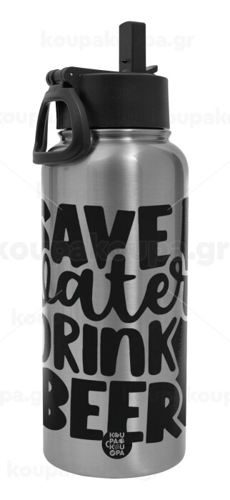 Save Water, Drink BEER, Μεταλλικό παγούρι θερμός Silver με καλαμάκι και χερούλι (Stainless steel), διπλού τοιχώματος, 950ml