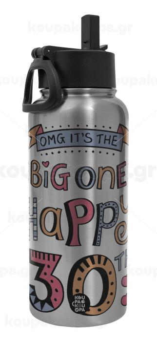 Big one Happy 30th, Μεταλλικό παγούρι θερμός Silver με καλαμάκι και χερούλι (Stainless steel), διπλού τοιχώματος, 950ml