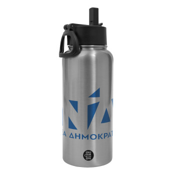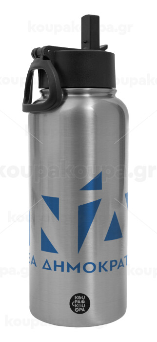 Νέα δημοκρατία, Μεταλλικό παγούρι θερμός Silver με καλαμάκι και χερούλι (Stainless steel), διπλού τοιχώματος, 950ml