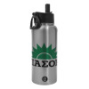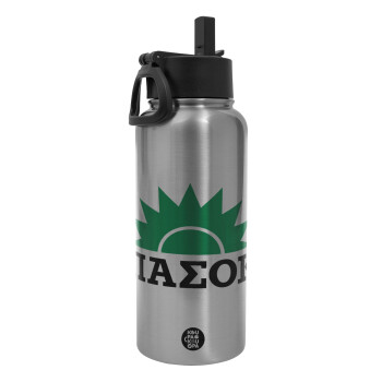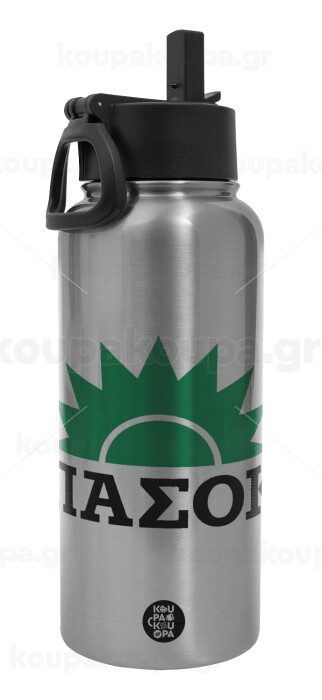 ΠΑΣΟΚ, Μεταλλικό παγούρι θερμός Silver με καλαμάκι και χερούλι (Stainless steel), διπλού τοιχώματος, 950ml