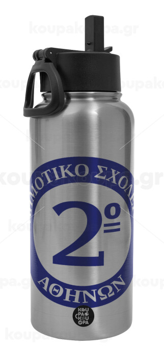 Έμβλημα Σχολικό μπλε, Μεταλλικό παγούρι θερμός Silver με καλαμάκι και χερούλι (Stainless steel), διπλού τοιχώματος, 950ml