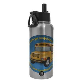 Στον αγαπημένο μου οδηγό σχολικού!, Μεταλλικό παγούρι θερμός Silver με καλαμάκι και χερούλι (Stainless steel), διπλού τοιχώματος, 950ml