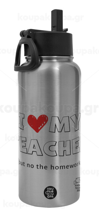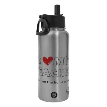 i love my teacher but no the homework outline, Μεταλλικό παγούρι θερμός Silver με καλαμάκι και χερούλι (Stainless steel), διπλού τοιχώματος, 950ml