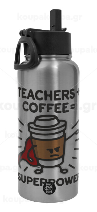 Teacher Coffee Super Power, Μεταλλικό παγούρι θερμός Silver με καλαμάκι και χερούλι (Stainless steel), διπλού τοιχώματος, 950ml