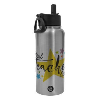 Teacher super star!!!, Μεταλλικό παγούρι θερμός Silver με καλαμάκι και χερούλι (Stainless steel), διπλού τοιχώματος, 950ml