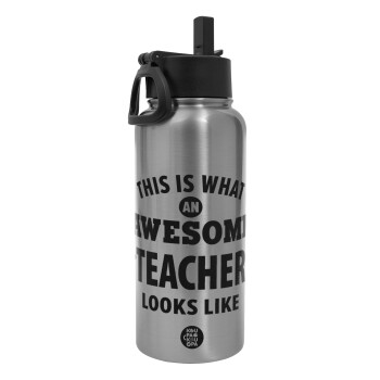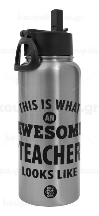 This is what an awesome teacher looks like hands!!! , Μεταλλικό παγούρι θερμός Silver με καλαμάκι και χερούλι (Stainless steel), διπλού τοιχώματος, 950ml