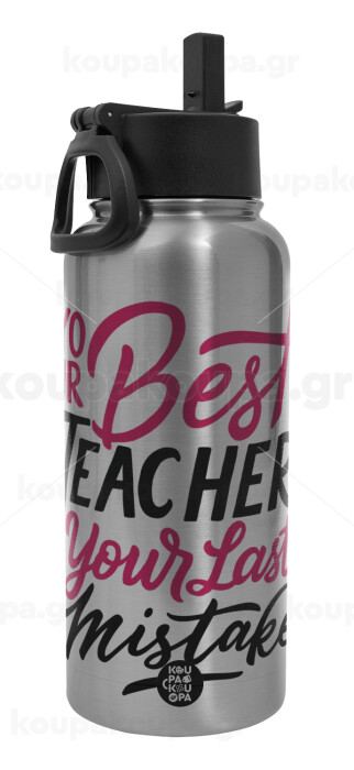 Typography quotes your best teacher is your last mistake, Μεταλλικό παγούρι θερμός Silver με καλαμάκι και χερούλι (Stainless steel), διπλού τοιχώματος, 950ml