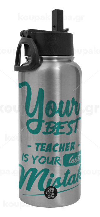 Your best teacher is your last mistake, Μεταλλικό παγούρι θερμός Silver με καλαμάκι και χερούλι (Stainless steel), διπλού τοιχώματος, 950ml