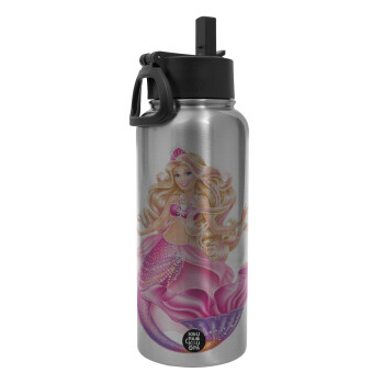 Barbie γοργόνα μπλε, Μεταλλικό παγούρι θερμός Silver με καλαμάκι και χερούλι (Stainless steel), διπλού τοιχώματος, 950ml