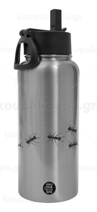 Μυρμήγκια, Μεταλλικό παγούρι θερμός Silver με καλαμάκι και χερούλι (Stainless steel), διπλού τοιχώματος, 950ml