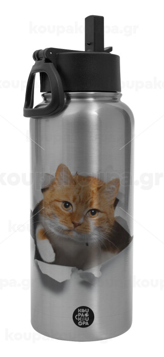 Cat cracked, Μεταλλικό παγούρι θερμός Silver με καλαμάκι και χερούλι (Stainless steel), διπλού τοιχώματος, 950ml
