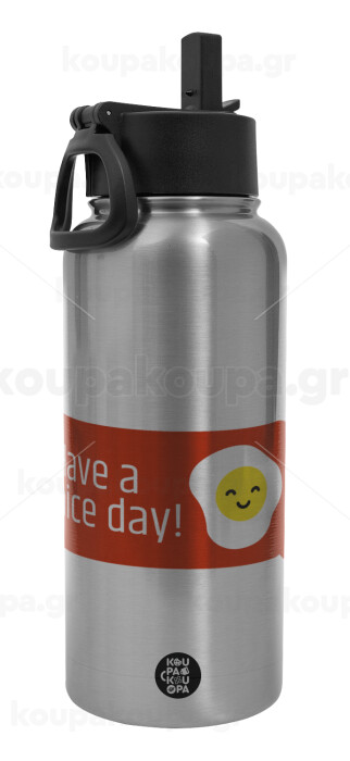 Have a nice day Emoji, Μεταλλικό παγούρι θερμός Silver με καλαμάκι και χερούλι (Stainless steel), διπλού τοιχώματος, 950ml