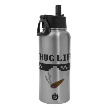 thug life, Μεταλλικό παγούρι θερμός Silver με καλαμάκι και χερούλι (Stainless steel), διπλού τοιχώματος, 950ml