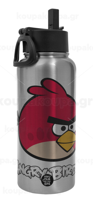 Angry birds Terence, Μεταλλικό παγούρι θερμός Silver με καλαμάκι και χερούλι (Stainless steel), διπλού τοιχώματος, 950ml