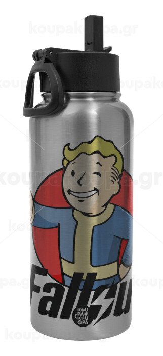 Fallout Vault Boy, Μεταλλικό παγούρι θερμός Silver με καλαμάκι και χερούλι (Stainless steel), διπλού τοιχώματος, 950ml