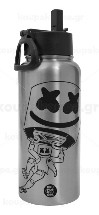 Fortnite Marshmello, Μεταλλικό παγούρι θερμός Silver με καλαμάκι και χερούλι (Stainless steel), διπλού τοιχώματος, 950ml