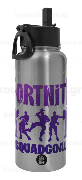 Fortnite #squadgoals, Μεταλλικό παγούρι θερμός Silver με καλαμάκι και χερούλι (Stainless steel), διπλού τοιχώματος, 950ml