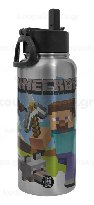 Minecraft Alex, Μεταλλικό παγούρι θερμός Silver με καλαμάκι και χερούλι (Stainless steel), διπλού τοιχώματος, 950ml