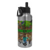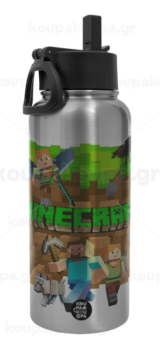 Minecraft characters, Μεταλλικό παγούρι θερμός Silver με καλαμάκι και χερούλι (Stainless steel), διπλού τοιχώματος, 950ml