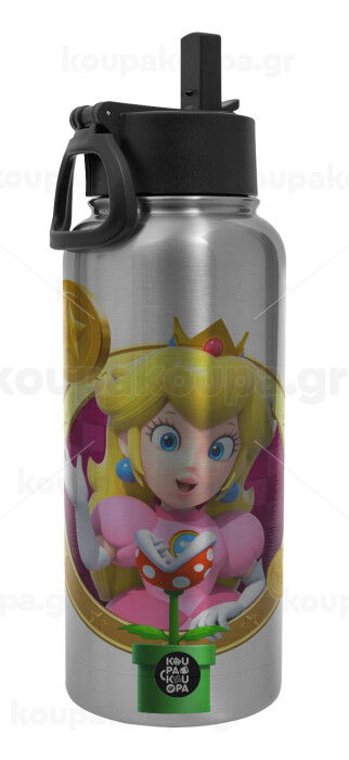 Princess Peach Toadstool, Μεταλλικό παγούρι θερμός Silver με καλαμάκι και χερούλι (Stainless steel), διπλού τοιχώματος, 950ml