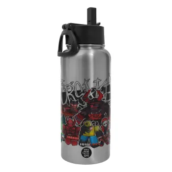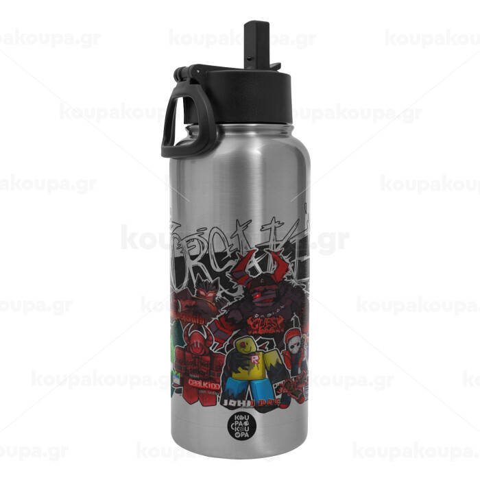 Roblox Forsaken, Μεταλλικό παγούρι θερμός Silver με καλαμάκι και χερούλι (Stainless steel), διπλού τοιχώματος, 950ml