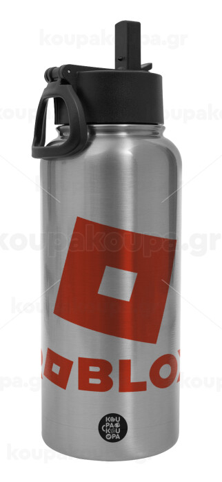 Roblox red, Μεταλλικό παγούρι θερμός Silver με καλαμάκι και χερούλι (Stainless steel), διπλού τοιχώματος, 950ml