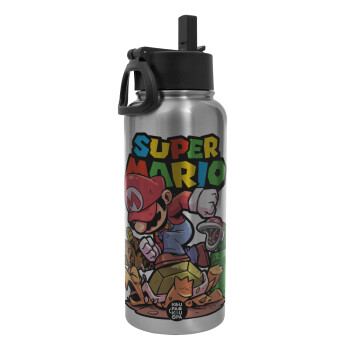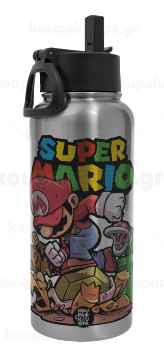 Super mario Jump, Μεταλλικό παγούρι θερμός Silver με καλαμάκι και χερούλι (Stainless steel), διπλού τοιχώματος, 950ml
