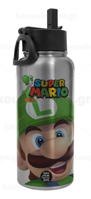 Super mario Luigi, Μεταλλικό παγούρι θερμός Silver με καλαμάκι και χερούλι (Stainless steel), διπλού τοιχώματος, 950ml
