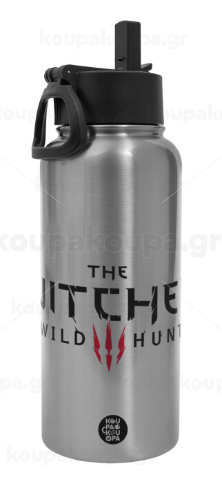 The witcher III wild hunt, Μεταλλικό παγούρι θερμός Silver με καλαμάκι και χερούλι (Stainless steel), διπλού τοιχώματος, 950ml