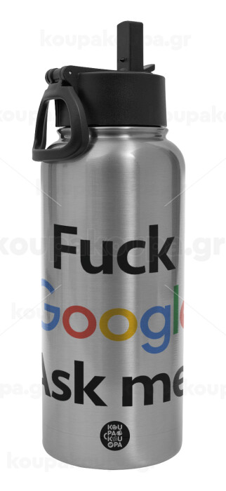 Fuck Google, Ask me!, Μεταλλικό παγούρι θερμός Silver με καλαμάκι και χερούλι (Stainless steel), διπλού τοιχώματος, 950ml