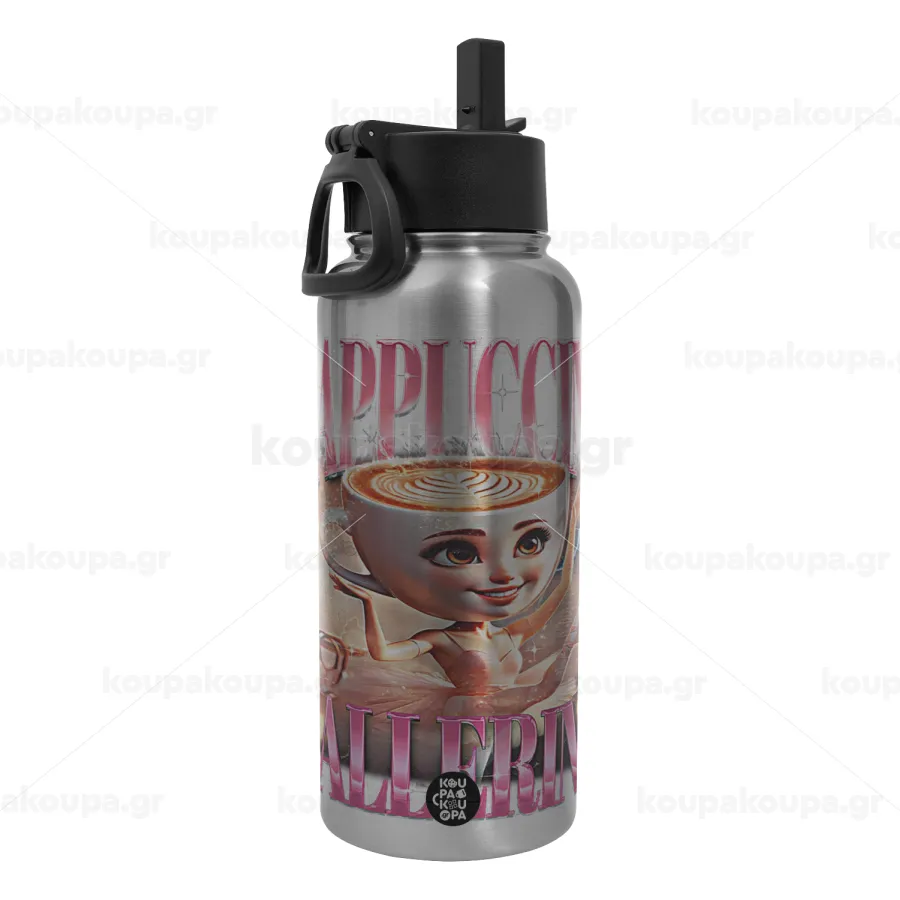 BALLERINA CAPUCHINA FUNK, Μεταλλικό παγούρι θερμός Silver με καλαμάκι και χερούλι (Stainless steel), διπλού τοιχώματος, 950ml