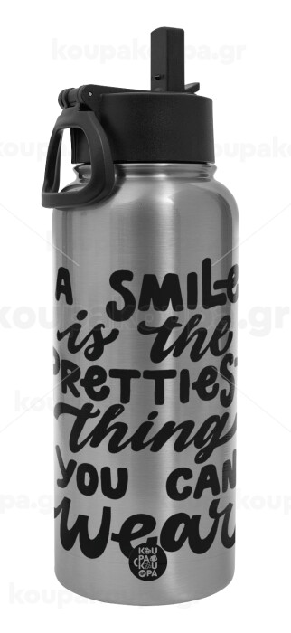 A smile is the prettiest thing you can wear, Μεταλλικό παγούρι θερμός Silver με καλαμάκι και χερούλι (Stainless steel), διπλού τοιχώματος, 950ml