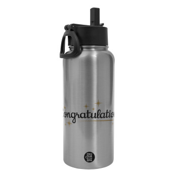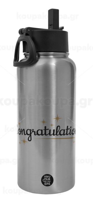 Congratulations, Μεταλλικό παγούρι θερμός Silver με καλαμάκι και χερούλι (Stainless steel), διπλού τοιχώματος, 950ml