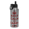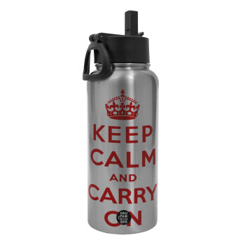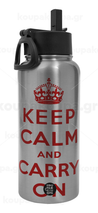 KEEP CALM  and carry on, Μεταλλικό παγούρι θερμός Silver με καλαμάκι και χερούλι (Stainless steel), διπλού τοιχώματος, 950ml