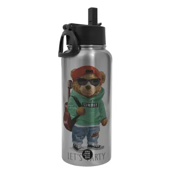 Let's Party Bear, Μεταλλικό παγούρι θερμός Silver με καλαμάκι και χερούλι (Stainless steel), διπλού τοιχώματος, 950ml
