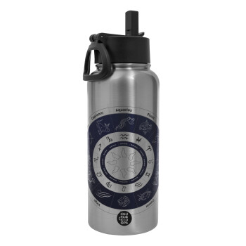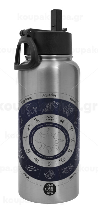 Ζωδιακός κύκλος, Μεταλλικό παγούρι θερμός Silver με καλαμάκι και χερούλι (Stainless steel), διπλού τοιχώματος, 950ml