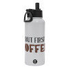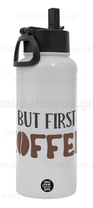 But first Coffee, Μεταλλικό παγούρι θερμός Λευκό με καλαμάκι και χερούλι (Stainless steel), διπλού τοιχώματος, 950ml