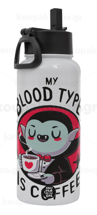 My blood type is coffee, Μεταλλικό παγούρι θερμός Λευκό με καλαμάκι και χερούλι (Stainless steel), διπλού τοιχώματος, 950ml