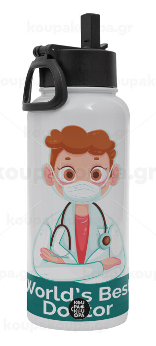 World's Best Doctor, Μεταλλικό παγούρι θερμός Λευκό με καλαμάκι και χερούλι (Stainless steel), διπλού τοιχώματος, 950ml
