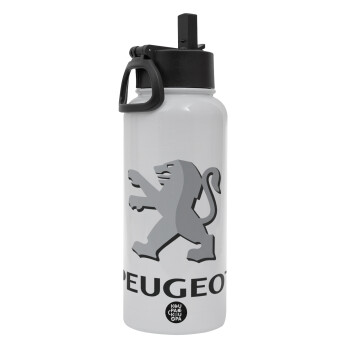Peugeot, Μεταλλικό παγούρι θερμός Λευκό με καλαμάκι και χερούλι (Stainless steel), διπλού τοιχώματος, 950ml