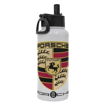 Porsche, Μεταλλικό παγούρι θερμός Λευκό με καλαμάκι και χερούλι (Stainless steel), διπλού τοιχώματος, 950ml