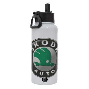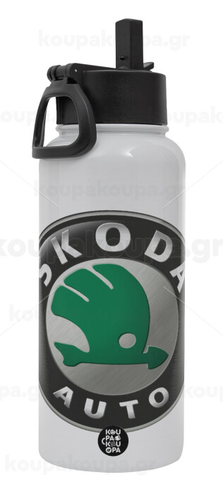 SKODA, Μεταλλικό παγούρι θερμός Λευκό με καλαμάκι και χερούλι (Stainless steel), διπλού τοιχώματος, 950ml