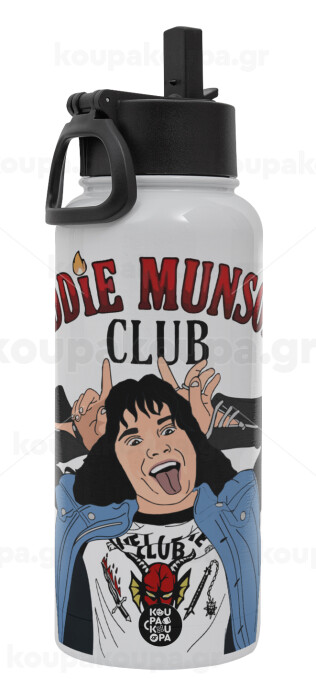 Eddie Munson, Μεταλλικό παγούρι θερμός Λευκό με καλαμάκι και χερούλι (Stainless steel), διπλού τοιχώματος, 950ml