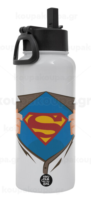 Superman hands, Μεταλλικό παγούρι θερμός Λευκό με καλαμάκι και χερούλι (Stainless steel), διπλού τοιχώματος, 950ml