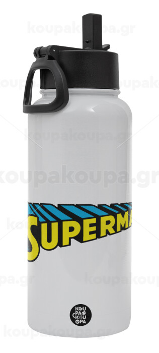 Superman vintage, Μεταλλικό παγούρι θερμός Λευκό με καλαμάκι και χερούλι (Stainless steel), διπλού τοιχώματος, 950ml