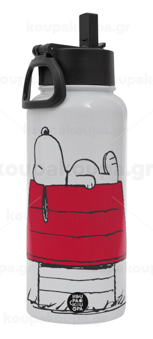 Το σπίτι του snoopy, Μεταλλικό παγούρι θερμός Λευκό με καλαμάκι και χερούλι (Stainless steel), διπλού τοιχώματος, 950ml