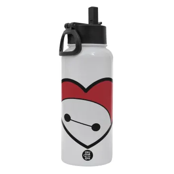 Baymax heart, Μεταλλικό παγούρι θερμός Λευκό με καλαμάκι και χερούλι (Stainless steel), διπλού τοιχώματος, 950ml