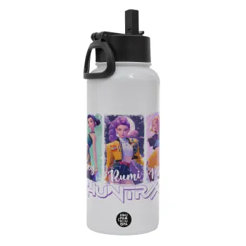HUNTR/X K-pop girl group, Μεταλλικό παγούρι θερμός Λευκό με καλαμάκι και χερούλι (Stainless steel), διπλού τοιχώματος, 950ml