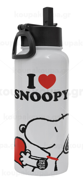 I LOVE SNOOPY, Μεταλλικό παγούρι θερμός Λευκό με καλαμάκι και χερούλι (Stainless steel), διπλού τοιχώματος, 950ml